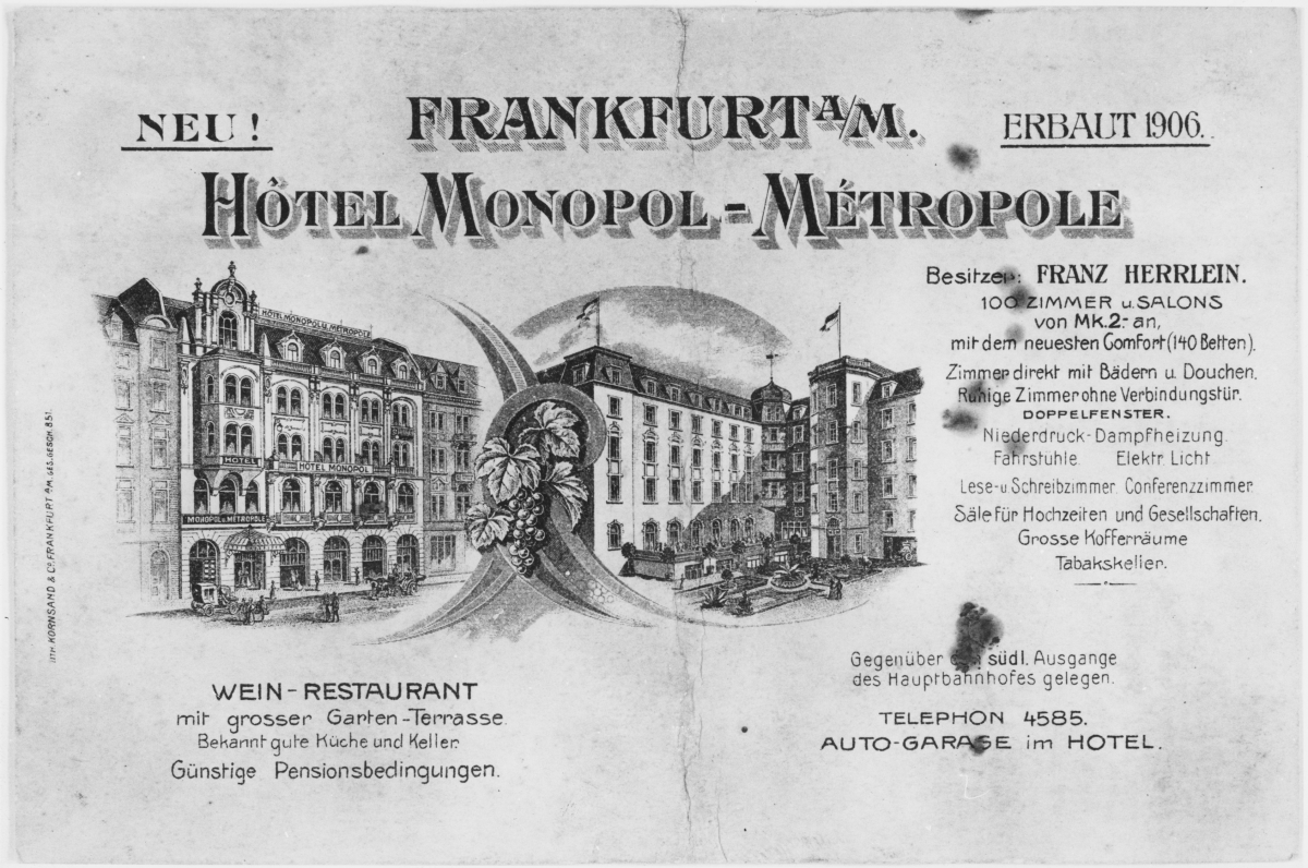Das 1906 erbaute historische Hotel Monopol ist eines der wenigen verbliebenen Hotels aus der Vorkriegszeit in Frankfurt am Main. Das ikonische Gebäude ist typisch für den Jugendstil und einzigartig in seiner Art.